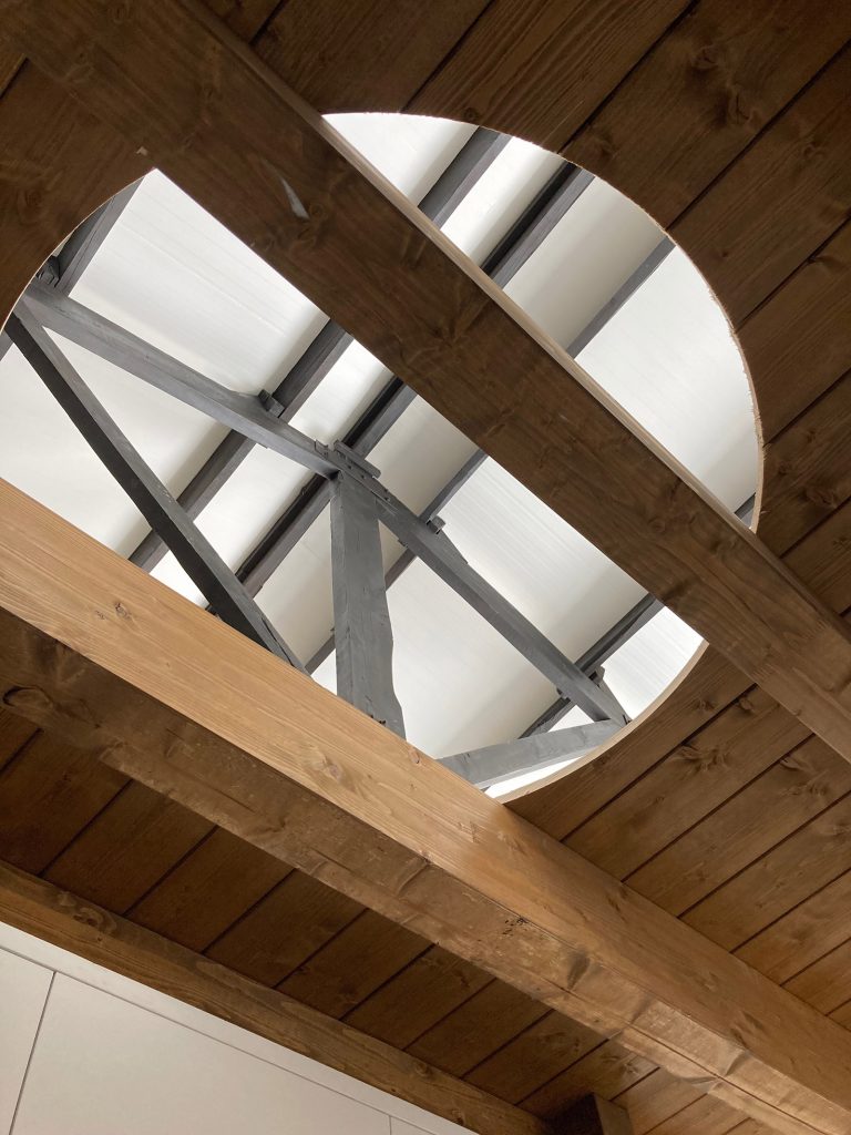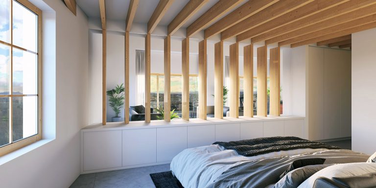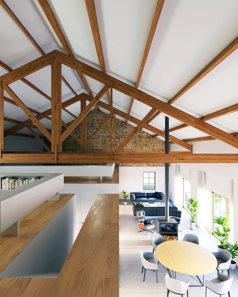 Para ello la actuación se limita a introducir dos volúmenes con los dormitorios. La zona de día de la vivienda (estar y cocina ) disfruta de la amplitud del espacio de la antigua nave y de unas vistas privilegiadas sobre la vega del rio Guadalope.
