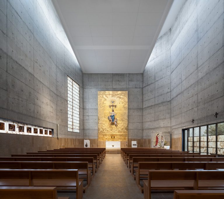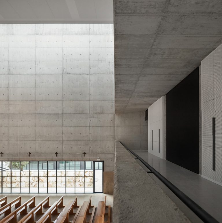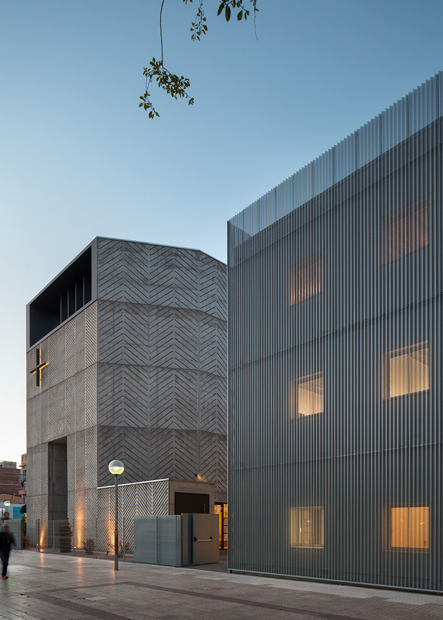 El edificio del centro parroquial se plantea como una superposición de instalaciones en tres niveles que generan espacios abiertos al patio. Este espacio abierto resuelve problemas funcionales y establece conexiones con el contexto urbano existente. El edificio de la iglesia destaca por su fuerte carácter espiritual y su relación con lo trascendental. La iglesia se eleva como un gran volumen de varias plantas donde la iluminación descendente enfatiza el espacio de manera vertical en su interior y transmite una sensación de ingravidez y profunda espiritualidad.